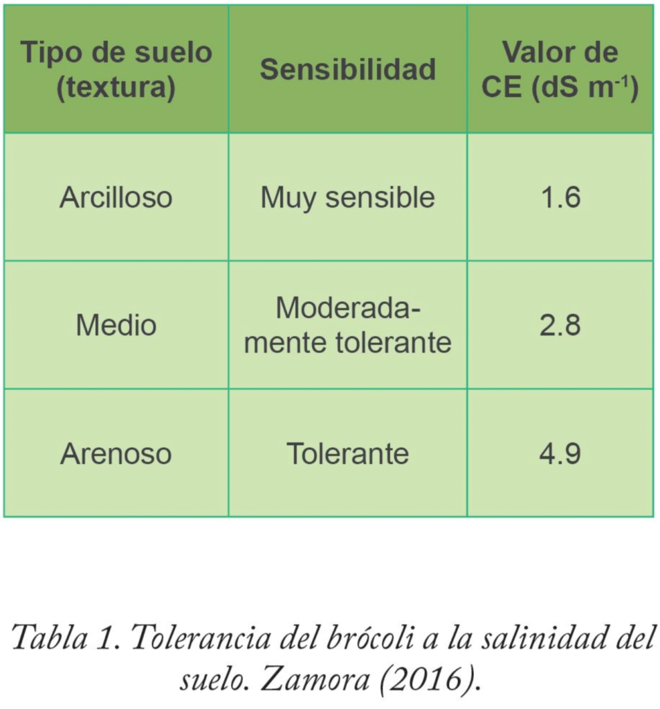 El cultivo de brócoli tolera distintos niveles de salinidad, dependiendo del tipo de suelo en el que esté instalado. La tabla 1 muestra diferentes niveles de tolerancia en función de la textura.