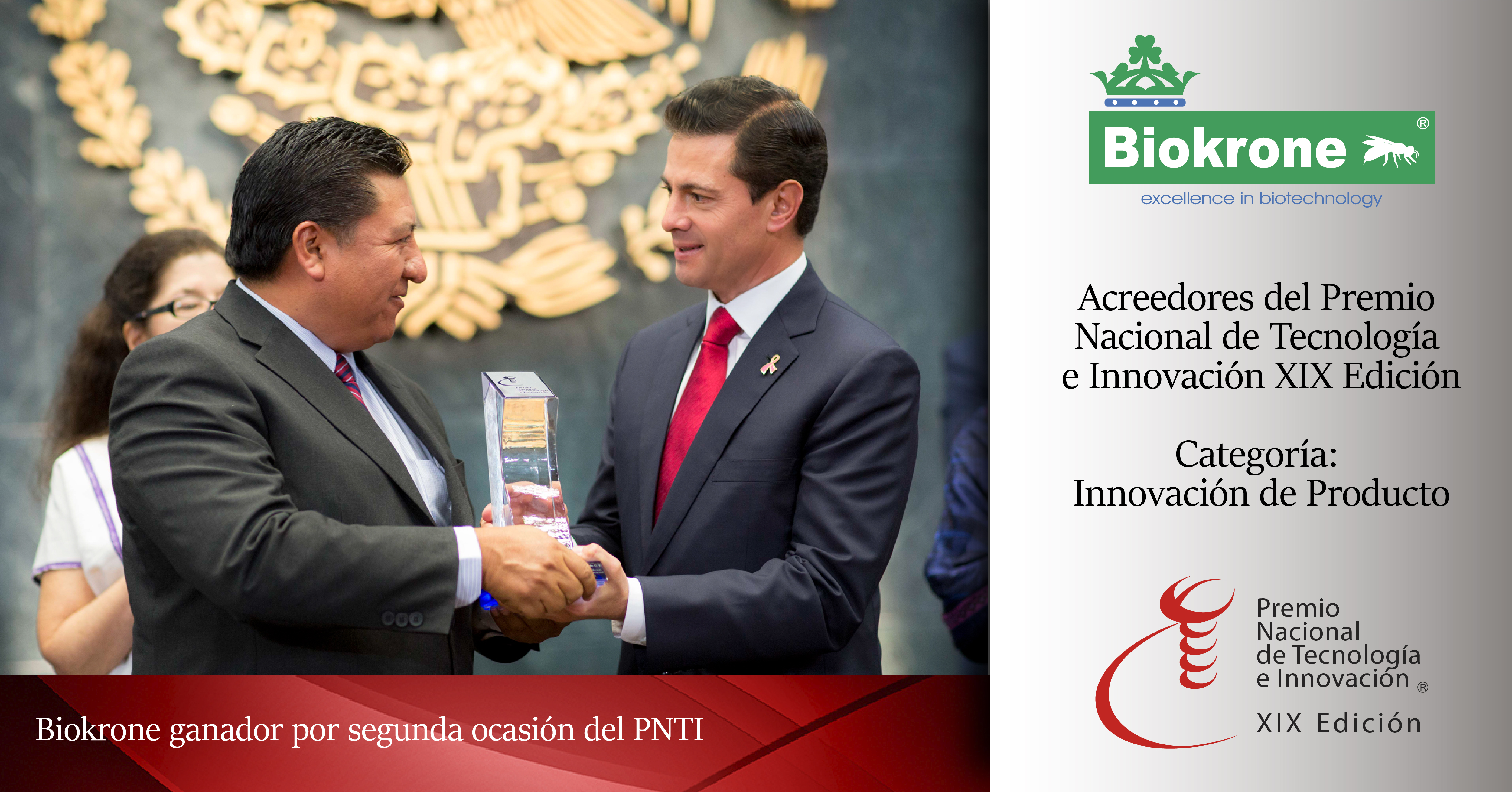 El Presidente de México, Enrique Peña Nieto entregó el XIX Premio Nacional de Tecnología e Innovación (PNTI) edición 2018 a la empresa Biokrone en la categoría Innovación de Producto, reconocimiento que recibieron únicamente seis empresas entre un total de 649 que participaron por el galardón.