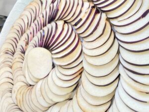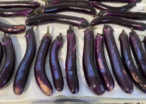 La forma alargada y uniforme de la berenjena tipo china, el color morado intenso en cáscara y color claro (casi blanco) de la pulpa, así como la poca oxidación por corte, la hicieron idónea para este proyecto