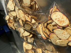 Después de realizar pruebas empleando distintos tipos de berenjena (filipina, china, india, tailandesa y americana), diferentes temperaturas y tiempos de secado, así como diversos tipos de corte, entre otros factores, se logró obtener una botana tipo “chip” de berenjena china, con un sabor agradable, textura crujiente y con buena aceptabilidad por parte de consumidores potenciales.