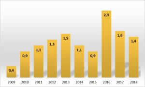 Observando la evolución de las cifras económicas anuales, se puede apreciar que la cantidad de las importaciones fue aumentando en el periodo 2009 – 2013. En los dos años siguientes, disminuyó progresivamente para alcanzar su máximo en el año 2016, con una cifra de 2.3 millones de dólares, que contrasta notablemente con el importe del año anterior, que fue muy inferior (0.9 millones). Posteriormente, también se redujo durante los años siguientes.