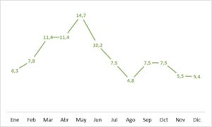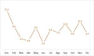 Las importaciones anuales de piña no se distribuyen de forma uniforme cada mes, sino que presentan distintas proporciones a lo largo del año (gráfica 2), destacando por encima de todos, enero, con un 17.2 % del total anual. Los meses de septiembre y noviembre también presentan una buena proporción, con cifras del 11 % y 12.2 %, respectivamente. A lo largo del año, se producen aumentos y descensos entre los distintos meses respecto a los volúmenes importados. El mes de junio es el que presenta una menor cuota, con tan solo el 2.6 % del total anual.