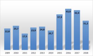 De forma análoga a lo sucedido con las importaciones, la serie histórica de exportaciones entre 2009 y 2018, también experimentó subidas y bajadas sucesivas entre los distintos años (gráfica 3), destacando el trienio 2015-2016-2017, que alcanzó su máximo en 2016 con 43.9 millones de dólares. Al año siguiente se produjo un descenso que se prolongó hasta los mencionados 31.2 millones en 2018.
