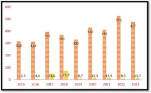 En la figura 1 se puede observar la evolución del valor económico anual referente a importaciones (en rojo) y exportaciones (en amarillo) durante el periodo 2015 – 2023, destacando 2022 como el año con una cifra más alta en concepto de importaciones (526 millones de dólares). Por su parte, el año con la cifra más alta correspondiente a las exportaciones fue 2018, con 73.3 millones.