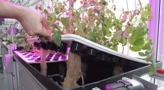 Fotografía de unos cultivos verticales con fotosíntesis en una combinación de luz natural y artificial.