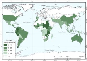En cuanto a su distribución mundial, ésta es muy amplia, extendiéndose por gran parte del globo. De este modo, la caña de azúcar se puede encontrar en casi todo el continente americano, en la península ibérica (España y Portugal), en numerosos países de África y Asia, y también en Australia. En la figura 1 se puede observar dicha distribución, mostrando los distintos países productores de caña, así como sus datos de rendimiento.