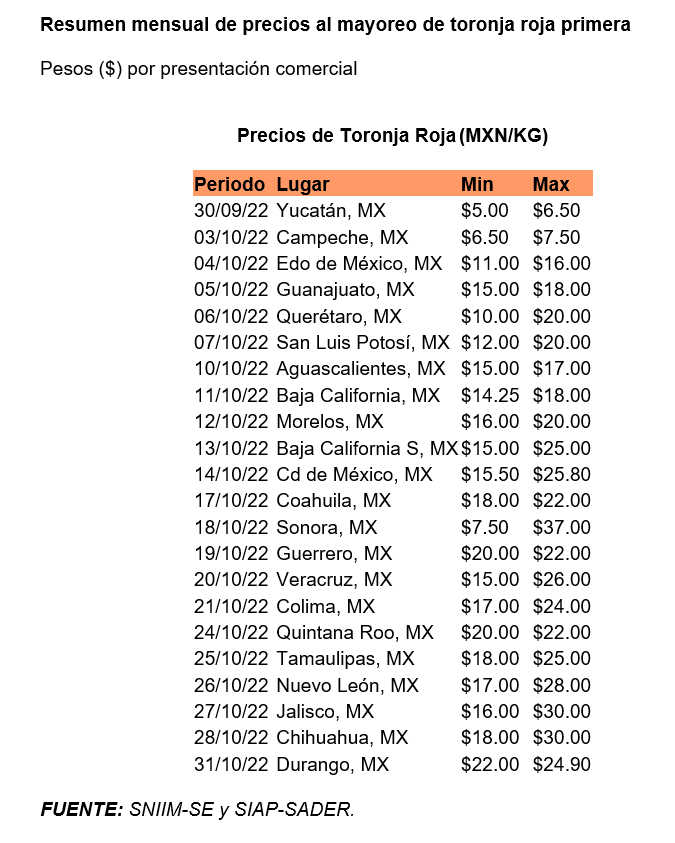 El Sistema Nacional de Información e Integración de Mercados (SNIIM-SE) y el Servicio de Información Agroalimentaria y Pesquera (SIAP-SADER), reportan que en octubre, el seguimiento de precios para la toronja se realizó en 22 ciudades: Aguascalientes, Ags.,La Paz, BCS; Tijuana, BC; Campeche, Camp.; Torreón, Coah.; Chihuahua y Ciudad Juárez, Chih.; Colima, Col.; Ciudad de México; Durango, Dgo.; León, Gto.; Acapulco, Gro.; Guadalajara, Jal.; Toluca, Edo.Mex., Tepic, Nay.; Monterrey, NL; Querétaro, Qro.; San Luis Potosí, SLP; Culiacán, Sin.; Hermosillo, Son.; Villahermosa, Tab.; y Veracruz, Ver.