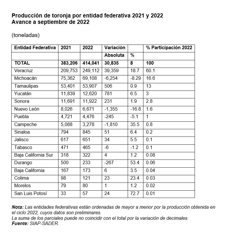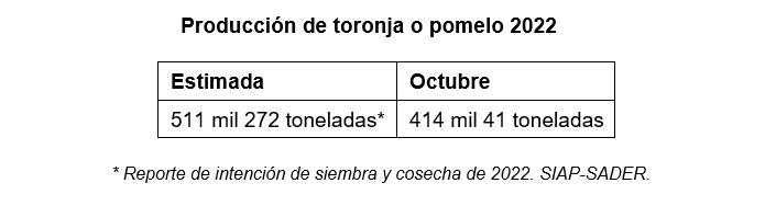 La superficie sembrada de toronja es de 21 mil 601 hectáreas (has.); 122 hectáreas más (0.5%) que al mismo mes del año previo (21 mil 479). La expectativa de producción para este año es de 511 mil 272 toneladas.