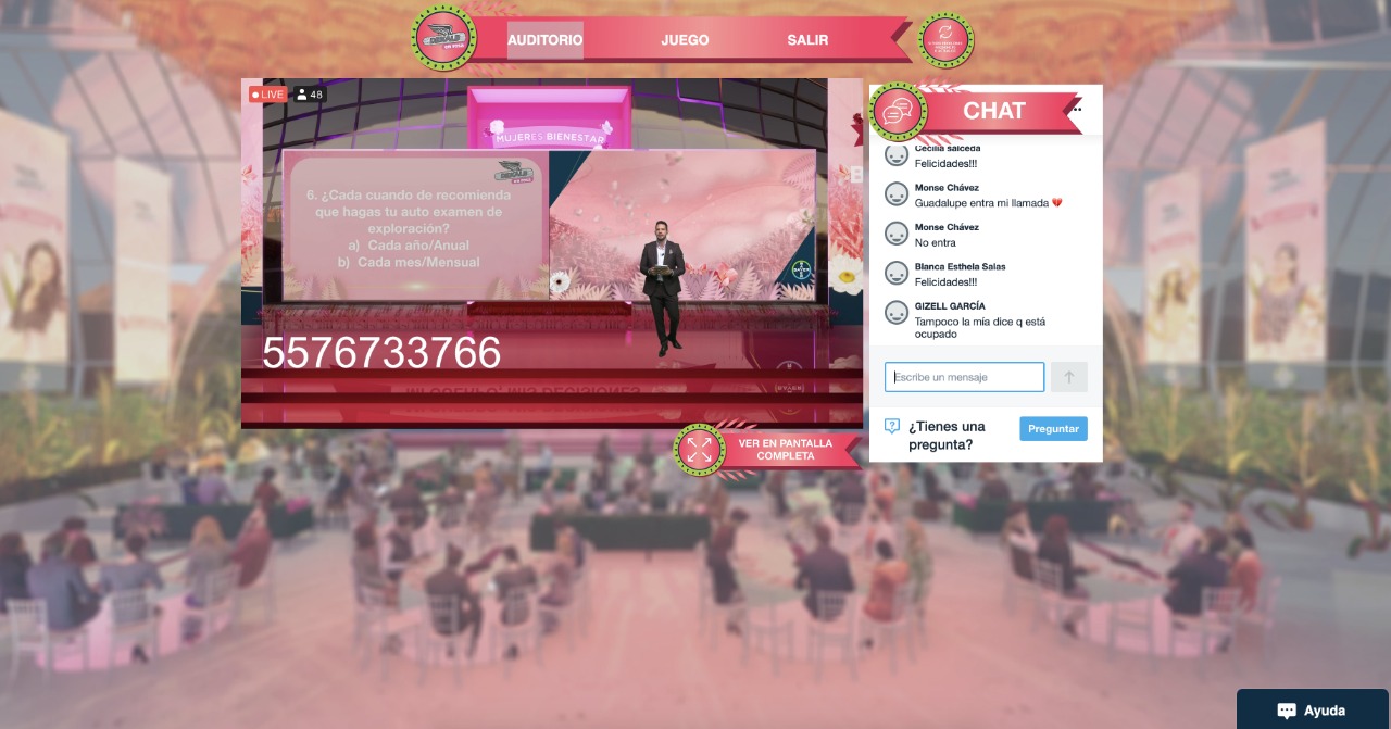 Si tu llegada era anticipada, podías visualizar un timer, seguido de este, entrabas a un portal donde simulaba desde tu llegada al recinto hasta las puertas del salón virtual donde se celebró el evento, misma que comenzaba con un presentador, seguido de una charla con una especialista en el tema para crear conciencia sobre el Cáncer de mama y cervicouterino, acompañado de una sección de preguntas y respuestas donde las mujeres asistentes podían exponer sus dudas e inquietudes al respecto, y para cerrar con broche de oro, se llevó a cabo una rifa que constó de 10 preguntas que al contestar correctamente, apremiaban a un kit de regalo, donde el presente estelar de este kit, era una mastografia; mostrándose con entusiasmo, más de 60 mujeres de diversas partes del País y cercanas al sector de la agroindustria, se dieron cita para informarse y pasar una tarde amena de la mano del programa DEKALB® en Rosa.