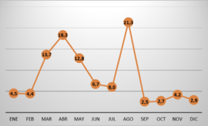 Existen dos picos en cuanto a la importación de limón. Uno se produce en los meses de marzo (13.7 %), abril (18.3 %) y mayo (12.8), que suman el 44.8 %, es decir, casi la mitad del limón importado se produce en estos tres meses. El otro pico ocurre en el mes de agosto, con el 21.3 % del total anual. Por tanto, sumando los cuatro meses mencionados, suponen casi dos terceras partes. Como se puede observar en la gráfica, el resto de meses ofrecen valores bastante inferiores a estos cuatro.