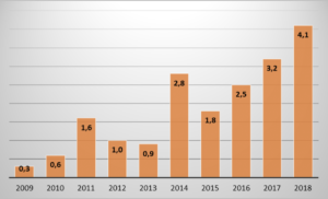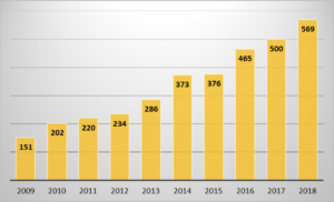 Como se puede observar, al inicio de la década, las cifras eran relativamente bajas, pero se produjo un gran incremento en 2014 con respecto al año anterior. Posteriormente, en 2015, el crecimiento ha sido constante, mostrando el valor máximo de la serie histórica en 2018.