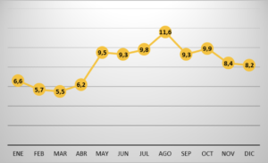 El periodo comprendido entre mayo y octubre quizá sea donde se produzcan los datos más altos de exportación, con el mes de agosto al alza (11.6 %), aunque también es preciso decir que en los meses restantes dichos volúmenes tampoco se desploman. Por tanto, se puede concluir que la exportación de limón se mantiene más o menos constante a lo largo de todo el año.