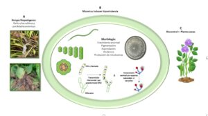 Figura 2. Hipovirulencia mediada por micovirus. (A) Los hongos fitopatógenos representan una amenaza para los cultivos, causando daños significativos y pérdidas económicas, (B) Los micovirus emergen como una opción prometedora de biocontrol, alterando la morfología de los hongos fitopatógenos, lo que afecta el crecimiento, la pigmentación, la esporulación y la virulencia. Se transmiten horizontalmente mediante la fusión de hifas y verticalmente a través de esporas asexuales, promoviendo su expansión en las poblaciones de hongos y contribuyendo a su persistencia; (C) Esta capacidad de control biológico convierte a los micovirus en agentes potenciales para combatir enfermedades fúngicas en cultivos, ofreciendo una alternativa promisoria.
