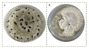 B.- Colonia con un patrón de crecimiento anormal del micelio y baja o nula producción de esclerocios mostrando afectación del hongo por la infección de micovirus.