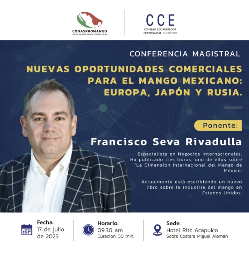 El Comité Nacional Sistema Producto Mango (CONASPROMANGO) y el Consejo Coordinador Empresarial de Guerrero van a ofrecer a productores y empacadores una conferencia magistral el próximo 17 de julio a las 9.30 am en el Hotel Ritz de Acapulco, denominada Nuevas Oportunidades Comerciales para el Mango Mexicano”, impartida por el Licenciado Francisco Seva Rivadulla, Comunicólogo y Especialista en Negocios Internacionales.