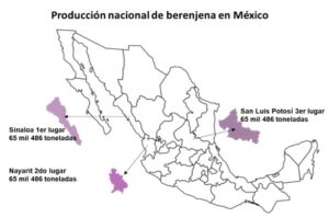 El cultivo de berenjena (Solanum melongena L.) en México al final del año 2023 posicionó a nuestro país como decimoctavo productor mundial de esta hortaliza con 91,057 toneladas en 1,710 hectáreas. La berenjena se produce principalmente en los estados de Nayarit, San Luis Potosí y Sinaloa, este último aporta el 71.91 % del total de la producción, siendo el primer productor nacional (Figura 1).