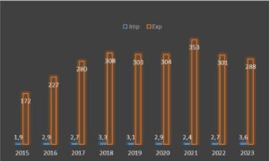 Se podría destacar al respecto que, durante los primeros años de la serie histórica representada, se produce una tendencia creciente entre 2015 y 2018, con un cierto estancamiento, incluso disminución, los dos años posteriores. Sin duda, el año clave es 2021, donde se experimenta un incremento en el valor de las exportaciones unido a un decrecimiento del valor de las importaciones, aunque se invierte el comportamiento de ambas variables los dos últimos años de dicha serie.