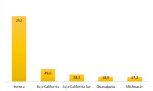 La Secretaría de Economía destaca, igualmente, como los estados del país que presentan las mayores cifras exportadoras de espárragos, tanto frescos como refrigerados, en dicho año a Sonora, Baja California, Baja California Sur, Guanajuato y Michoacán, cuyos datos económicos se muestran en la figura 3 (datos en millones de dólares).