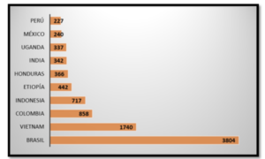 Fig. 2. Principales países productores de café en el mundo (millones de kg).
