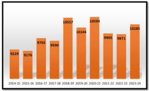 A este respecto, las cuatro primeras campañas agrícolas representadas, comprendidas entre 2014-15 y 2017-18, no alcanzaron los 10 mil millones de kg, aunque sí superaron los 9 mil millones. En la campaña 2018-19 se incrementó el volumen de café hasta los 10,557 millones (unos 176 millones de sacos de 60 kg), superando la cifra de los 10 mil millones los dos años siguientes.