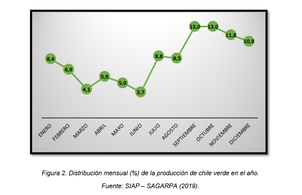 Por otra parte, es importante destacar que la disponibilidad de chile, teniendo en cuenta su destacado papel en México, es efectiva durante todo el año, aunque se ve incrementada en la segunda mitad del año, especialmente entre septiembre y diciembre, con respecto a la primera mitad (fig. 2).