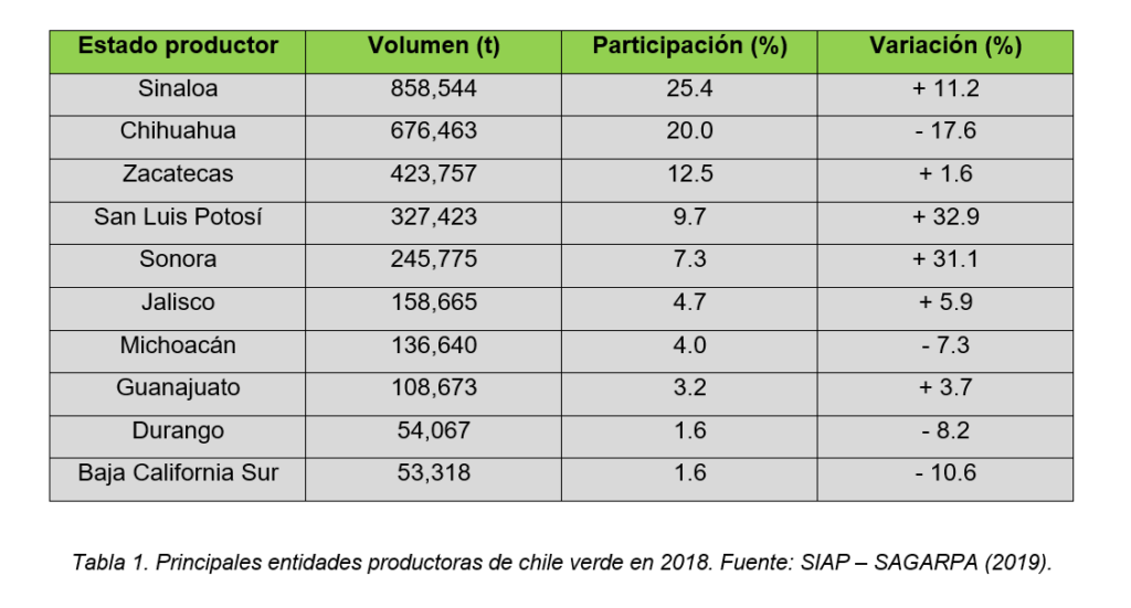 El mayor productor de chile verde del país es Sinaloa, cuyo volumen supone en torno al 25% del total. Además de generar los mayores volúmenes, también hay que considerar su alta especialización en los pimientos para la exportación, la cual incide en unos ingresos de venta superiores. Según SIAP (2019), éstos ascendieron a 5 mil 880 millones de pesos en 2018.