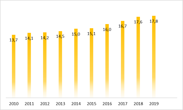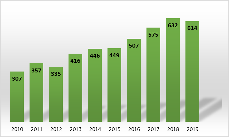 Tal como muestra el gráfico, a comienzos de la década se produjo un incremento de 50 mil toneladas entre 2010 y 2011. Al año siguiente, el volumen de producción descendió levemente y, a partir de 2013, el aumento, año tras año, fue continuo hasta 2018, donde se registró el máximo de la serie histórica mostrada, con 632 mil toneladas, aunque el año siguiente se originó un descenso de 18 mil toneladas, hasta las 614 mil.