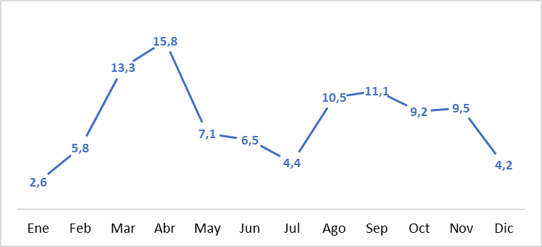 Viendo la evolución gráfica, se aprecia claramente que, entre marzo y abril se produce el 29.1 % de la producción anual. Posteriormente, existe una disminución, volviendo a incrementarse los volúmenes entre los meses de agosto y noviembre, concentrando el 40.3 % del total.