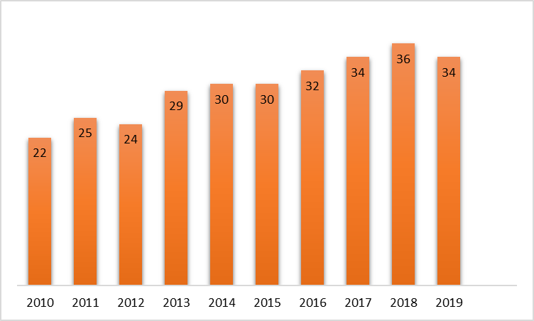 Gráfica 3. Evolución de la superficie nacional (miles de hectáreas) cosechada de brócoli entre 2010 y 2019. SIAP, 2020.