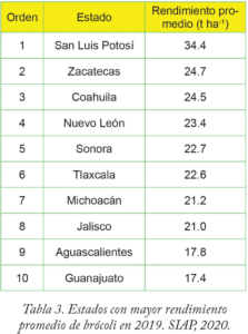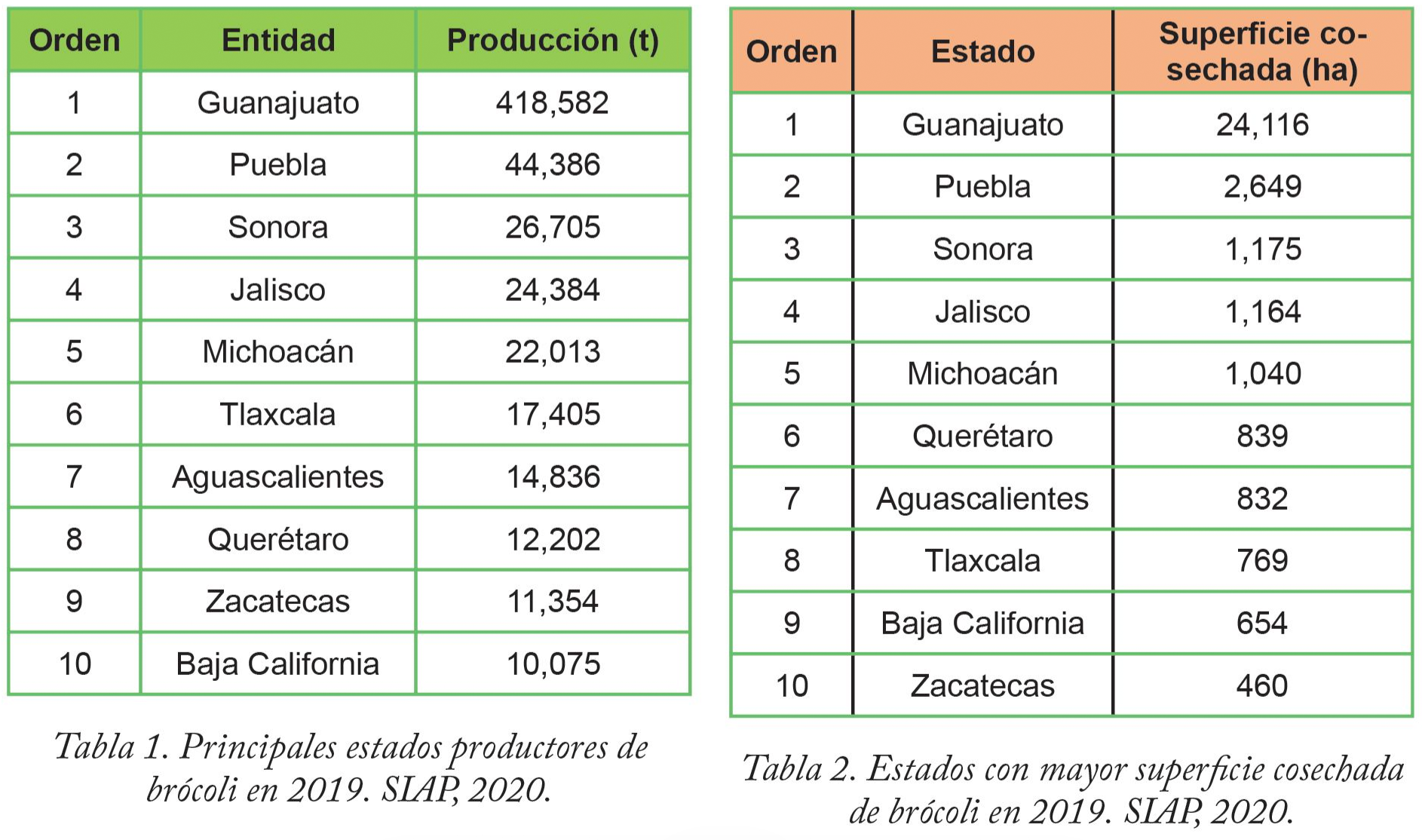 En cuanto a los estados del país que representan un papel más importante en el cultivo de brócoli, tanto en producción como en superficie, son enumerados a continuación, por orden de relevancia, en las tablas 1 y 2.