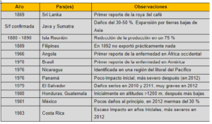 Después del reporte de la aparición de la roya del café, el cultivo cafetalero se expandió a muchas regiones del continente asiático y, posteriormente, a otros continentes, aunque también lo hizo la enfermedad, comenzando a causar pérdidas en diferentes zonas geográficas, mostrando algunos países en la tabla 1.