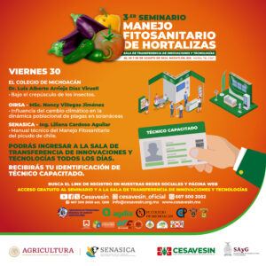 El Comité Estatal de Sanidad Vegetal del Estado de Sinaloa, en colaboración con la SADER, SENASICA, OIRSA y SAyG, se complace en invitar a todos los técnicos agrícolas al «Tercer Seminario Manejo Fitosanitario de Hortalizas» del 28 al 30 de agosto en el puerto de Mazatlán.